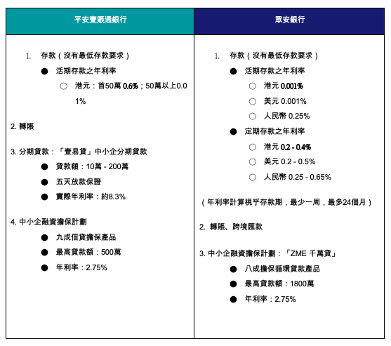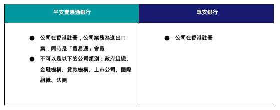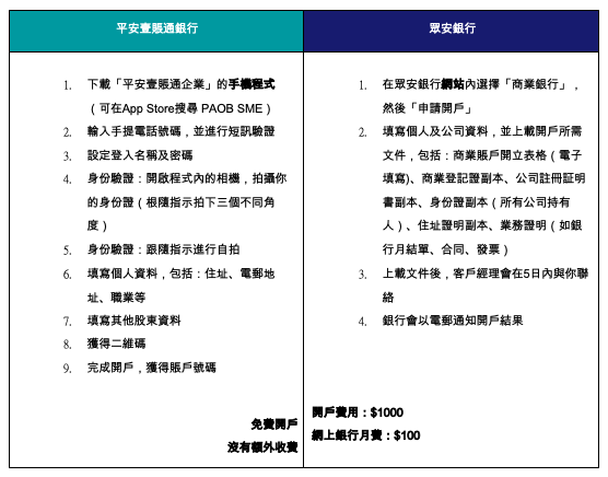 香港現時雖有八間虛擬銀行,但暫時只有兩間提供有關中小企的商業服務:平安壹賬通銀行(PAO Bank) 及眾安銀行(ZA Bank)。大家都知道在傳統銀行開戶困難,在虛擬銀行會否較容易?以下就開戶要求、開戶程序、銀行服務、其他配套四方面,對兩間銀行進行比較。前者的開戶限制較多,但擁有專為中小企而設的手機應用程序「PAOB SME」,服務也較多;後者雖然沒有專門的手機應用程序,但開戶門檻較低,只要是香港註冊公司即可,對初創公司來說頗為吸引。