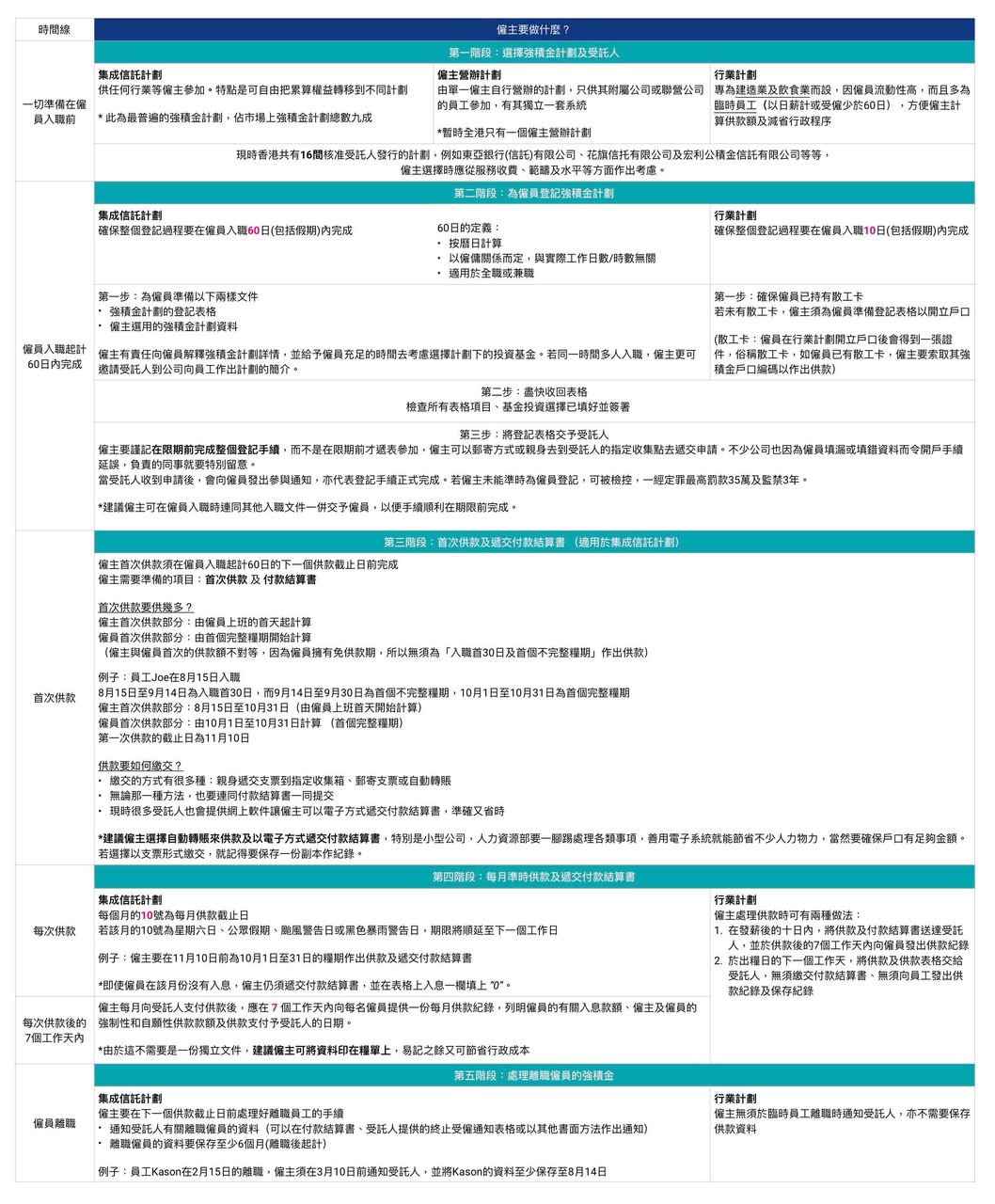 不少人也認為處理強積金的程序繁瑣,做錯或做漏也會觸犯法例。但只要記實這五個階段和三個重要數字,處理強積金就容易得多。小編亦十分建議企業善用由受託人提供的電子系統和網上資源來處理,例如下載由受託人設計的應用程式來計算供款額、以電子方式繳交各類文件、以自動轉帳供款。將事務盡量電子化,就不怕自己計錯數或者忘記交文件,絕對能省卻不少行政工夫。