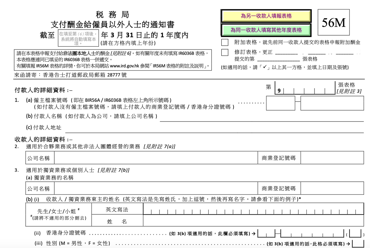 - 「支付酬金給僱員以外人士的通知書」(BIR56M表格)