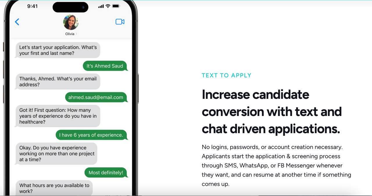 聊天機器人Olivia 能夠理解和回應求職者的查詢,以近乎自然的對話形式進行交談。當求職者通過公司的招聘頁面表達出對某職位空缺的興趣,Olivia 便開始其工作,引導求職者了解更多職位信息,甚至協助填寫職位申請表和安排面試時間的工作,最快只需3分鐘即可完成面試的安排。Olivia 還會利用預設的篩選標準,如特定的技能、資歷年數或學歷要求,快速及精確地識別出最合適的人才。
