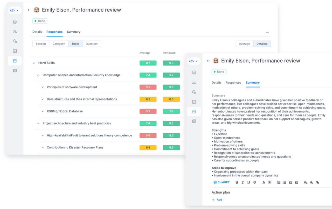 Effy可與常用的商業通訊工具如 Slack 和 Microsoft Teams 整合,使員工能在他們經常使用的平台上接收和填寫反饋,從而簡化評估過程並提高參與度。