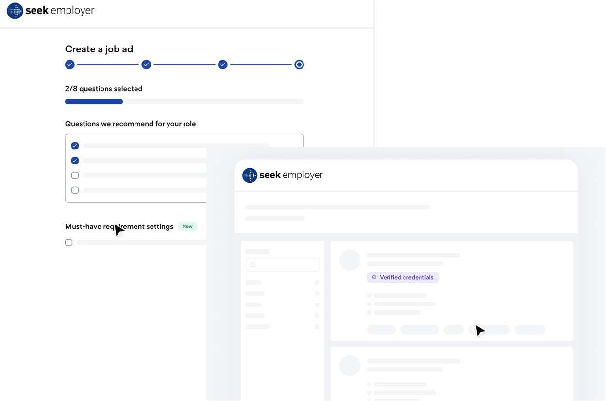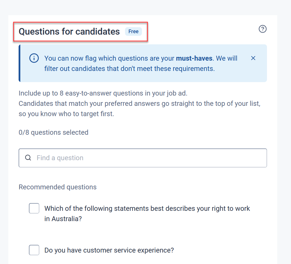 你亦可自訂最多八條問題。SEEK 擁有一個包含約3萬條篩選問題的題庫,例如:「你是否具備在香港工作的合法資格?」、「你是否持有駕駛執照?」、「你是否具備客戶服務相關經驗?」等。