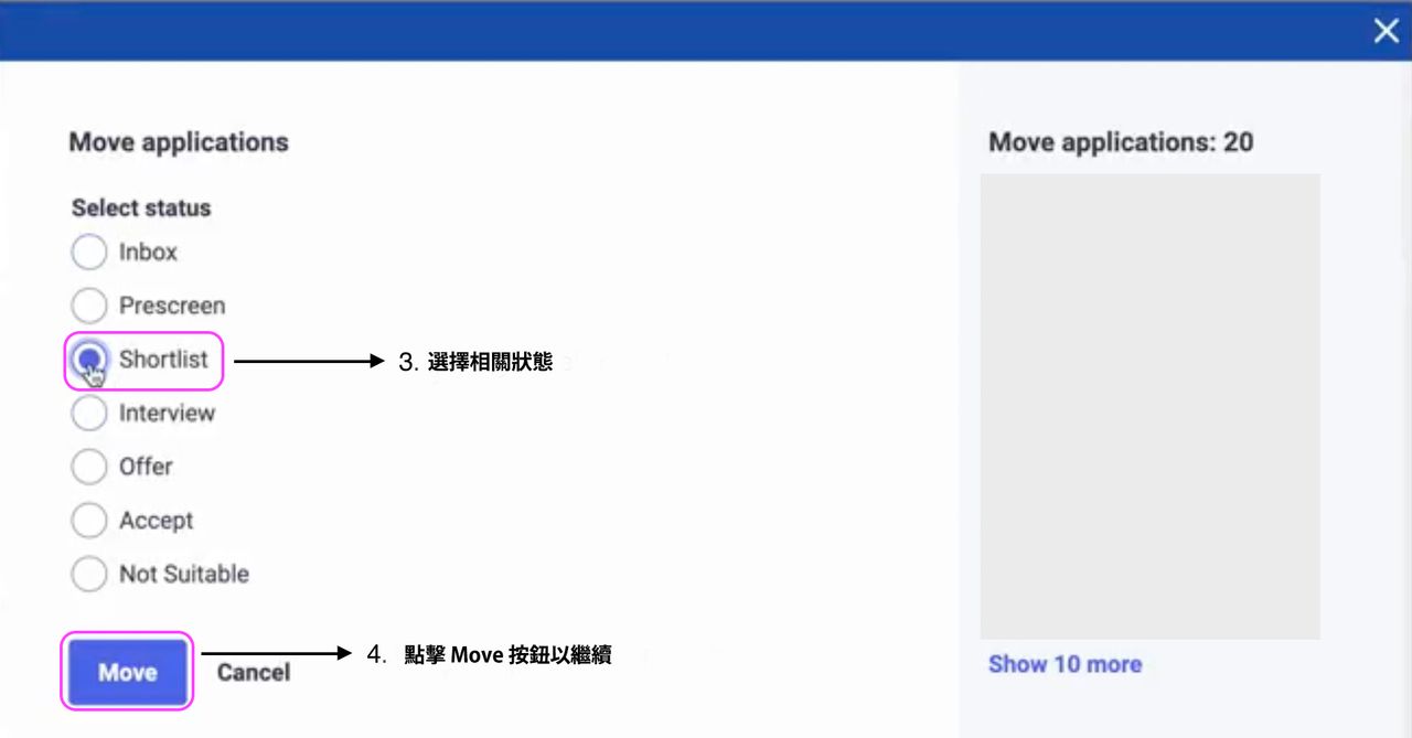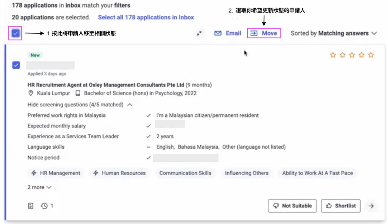 在篩選問題之中,HR 可進一步將關鍵問題標示為「Must-have」,即必須符合的條件。當申請人的答案未能達到指定要求時,系統會自動將該申請標示為「Not Suitable」,毋須 HR 逐一檢視履歷內容。這項功能特別適合用於處理硬性要求,例如法定工作資格、必要語言能力或專業牌照。下圖示範如何手動更新申請人狀態: