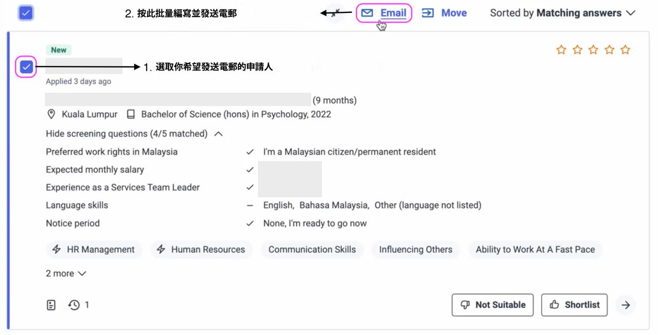 Step 5:善用批量處理功能,確保流程一致 在完成首輪篩選後,將Candidates分為” Shortlist”及”Not suitable”。透過 Candidate Management 系統,HR 可進行多項批量操作,包括批量發送電郵,系統會在申請人被標示為”Not suitable”後,於指定時間向對方發送通知。電郵通知示範如下: